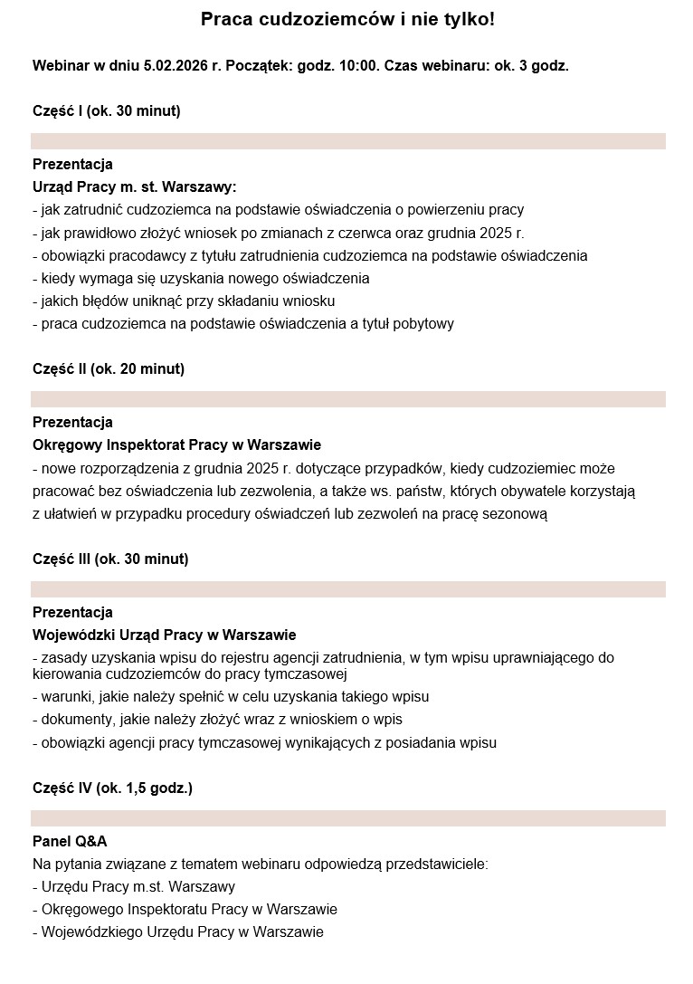 Już 5 lutego w godz. 10:00 - 13:00 odbędzie się bezpłatny webinar online dotyczący legalnego zatrudnienia cudzoziemców, podczas którego zostaną omówione zagadnienia obejmujące;