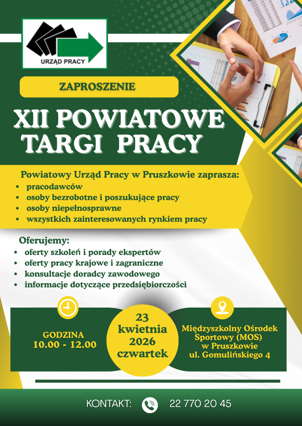 W dniu 23 kwietnia 2026 r. (czwartek) w godz. od 10.00 do 12.00 w Hali Międzyszkolnego Ośrodka Sportowego w Pruszkowie, przy ul. Gomulińskiego 4 odbędą się XII Powiatowe Targi Pracy, podczas których będzie możliwość skorzystania z bezpłatnych porad prawnych przedstawicieli Okręgowego Inspektoratu Pracy w Warszawie.